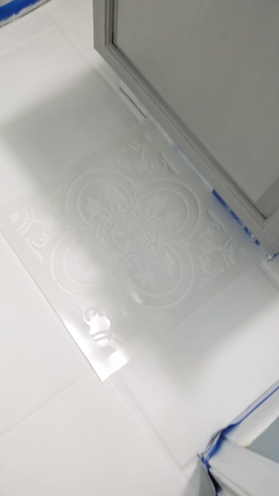 Step 5: Once you have completed all of the full size tiles you can begin to cut the stencil down to accommodate the edge tiles under the sink, around the edges and around the toilet. This takes some “figuring” out. I went in and identified the next largest tiles and worked my way down to the smallest from there. I’m really glad I had 2 stencils because there were a couple of shapes that I just would never be able to cut out of the same piece.