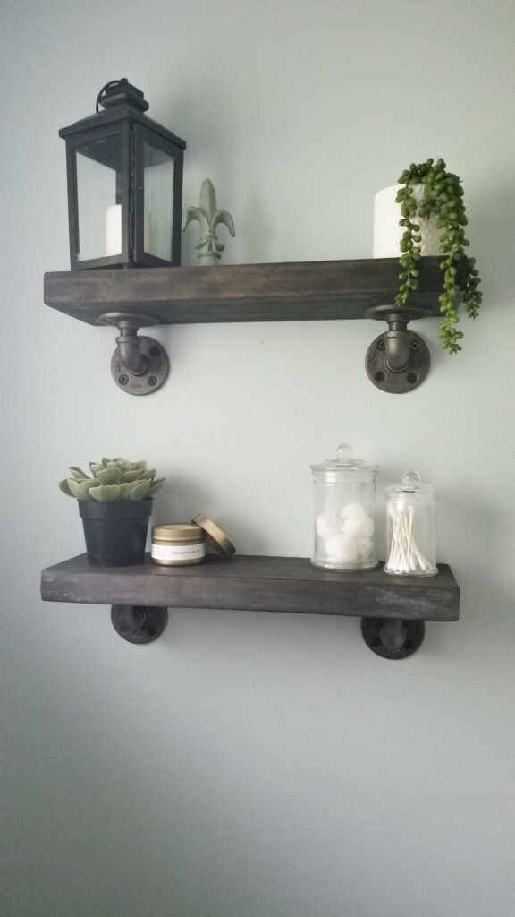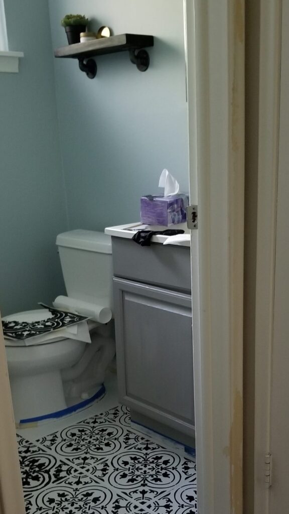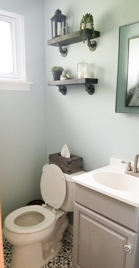 I had already started working on the bathroom facelift including a new light, fresh coat of paint on the walls, new shelves, and chalk painting the vanity myself, so at this point I was pretty invested in finishing the project.